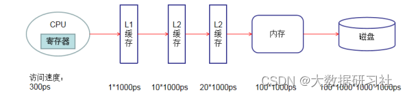 可以看出寄存器访问数据的速度,是内存的300倍,是磁盘的30000 万倍。