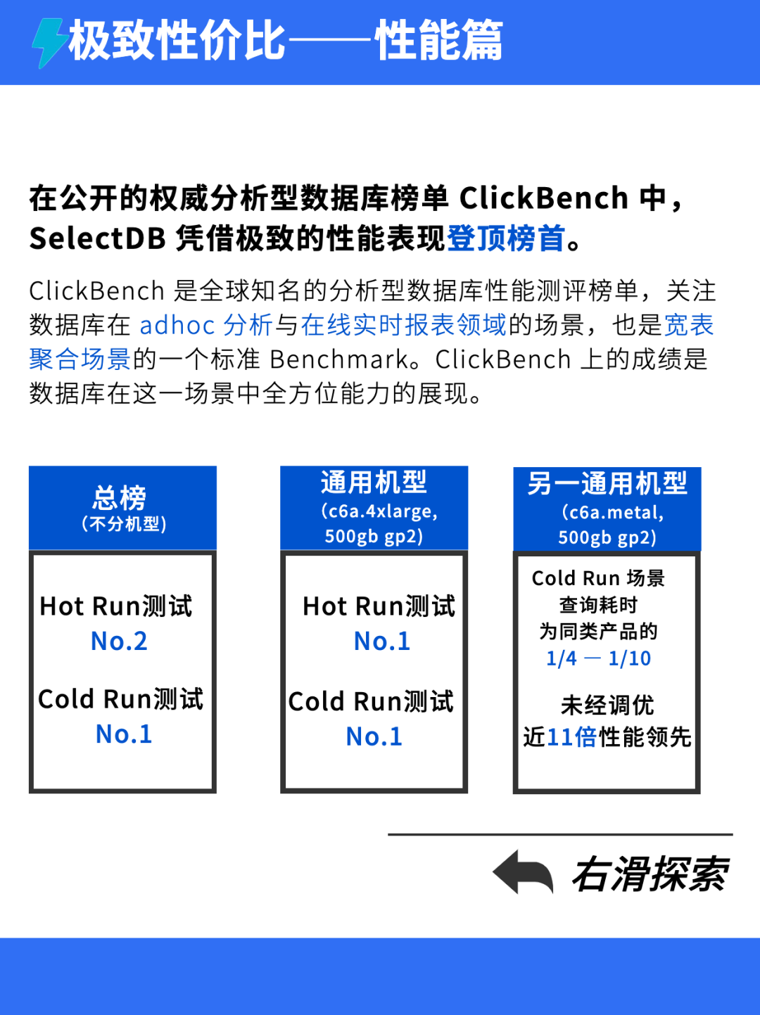 查询引擎的优化:基于 MPP 查询引擎进行优化,支持节点间和节点内并行执行;支持多张大表的分布式 shuffle join;;同时还支持类似 runtime filter 等动态执行技术,通过动态调整执行达到最优的执行效率。通过 colocate join 和 bucket shuffle join 优化能够减少数据传输,提升 join 性能。 高效的数据处理:采用了列式内存布局,向量化计算框架。大幅减少了虚函数调用,提高了 cache 命中率,高效利用了 simd 指令,从而使得算子的性能提升数十倍。 多种存储模式:采用了列式存储,使得编码、压缩、处理都非常高效;支持多种索引结构来做数据剪枝,加速数据扫描。支持物化视图,有效加速查询时的效率;支持多种存储模型。 智能优化策略:采用了 RBO 和 CBO 结合的智能优化器。即将发布的短路径优化,还能够支持数万 QPS 的并发点查。 云原生架构:SelectDB Cloud 云原生架构实现了本地磁盘缓存和对象存储的分层分级存储引擎 ——这样不同层级的存储成本带来综合成本大幅下降;同时在云原生架构实现了计算节点的分离和弹性,得以令计算资源的随需弹性扩缩容。