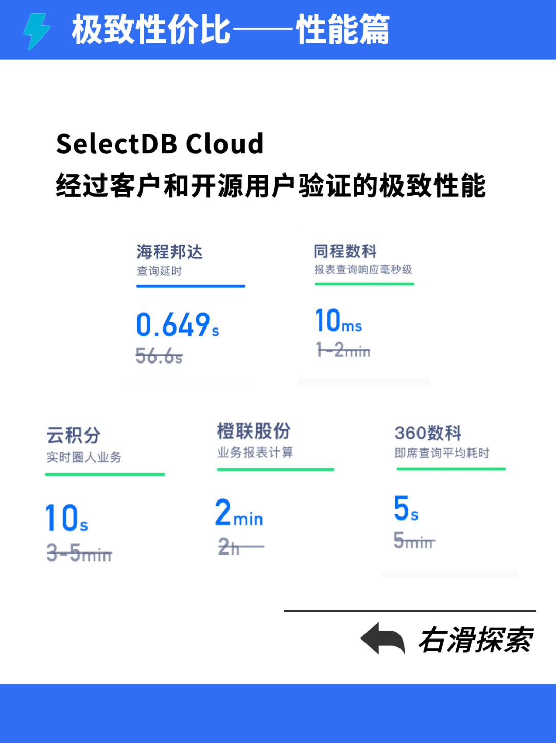 全面提升:SelectDB Cloud 针对报表场景能够达到上万并发;能够做到毫秒级别响应;针对数据流延时低的诉求,数据可见性最快可以做到秒级别;数据可靠,不丢不重。