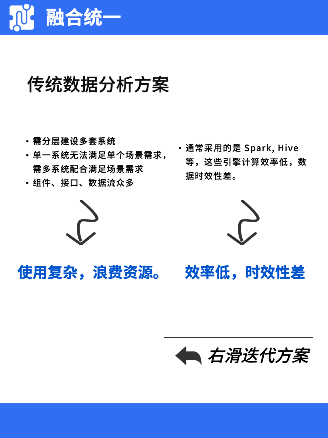 现状分析:当前企业普遍使用典型的湖仓并行架构方案,既有面向批量的多个组件、也有面向交互分析的多个组件,甚至不止一个湖一个仓。这样的数据平台解决方案存在的问题主要集中在复杂性高、性价比低、实时性差。