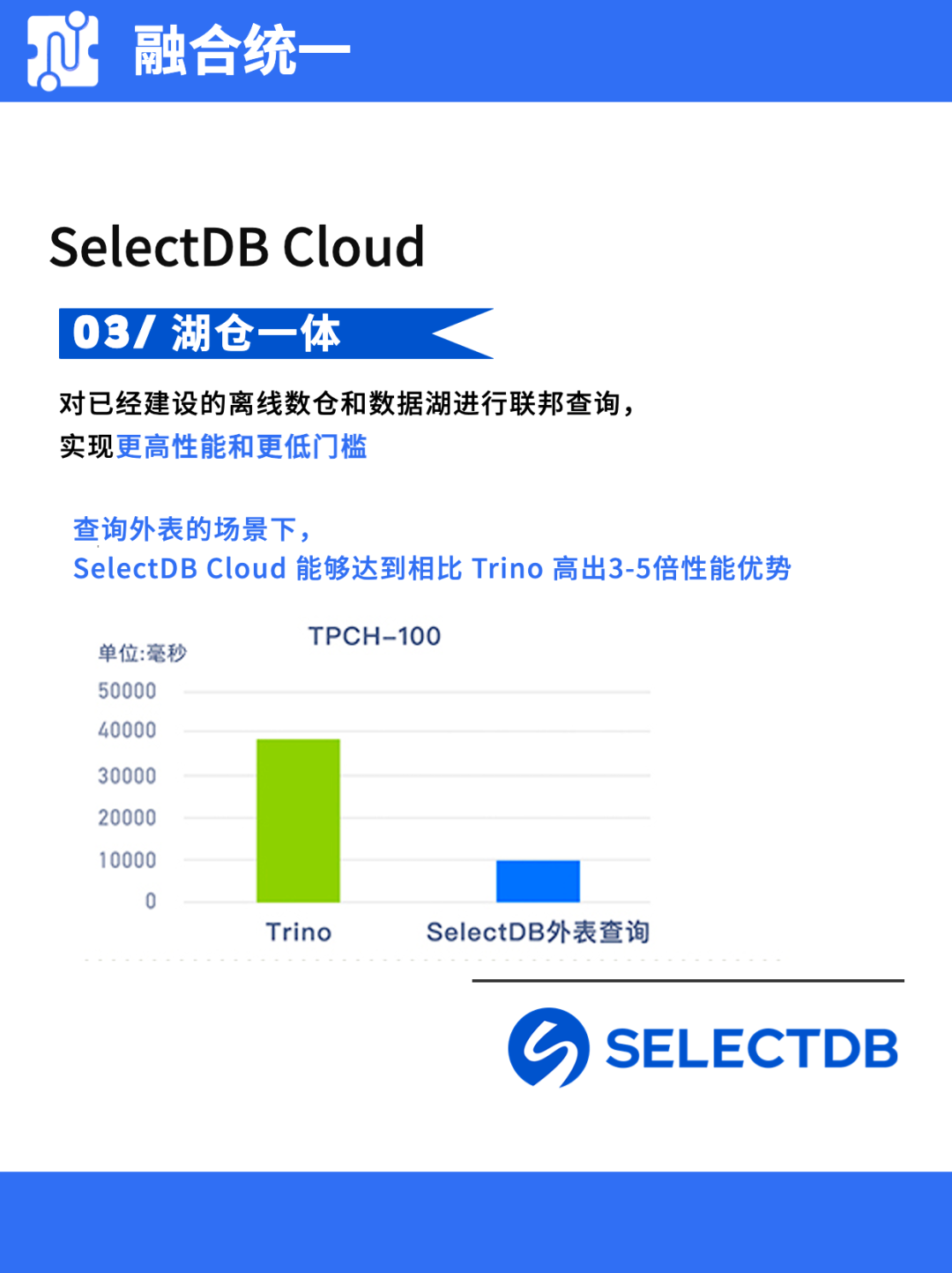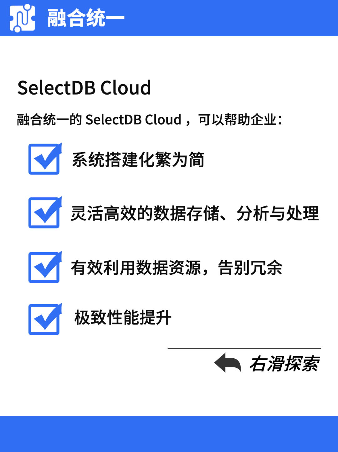 复杂性降低,成本和门槛下降:管理成本下降,数据平台收敛为了一个以云数仓为中心的架构。并且云数仓是一个云服务,不需要客户自己运行和维护;使用者使用的门槛降低了,不需要学习多套系统。 平台的经济性提升,提供了极高的性价比:综合资源成本降低,数据只存一份,存算分离、冷热分层、弹性扩缩容发挥优势;数据链路大大缩短,采用新型 ELT 数据集成和SelectDB 世界领先的性能为平台实时性带来质的提升。 多云可用,与开源系统的数据自由迁移,成为一个开放的系统,客户不用担心自己被锁定。