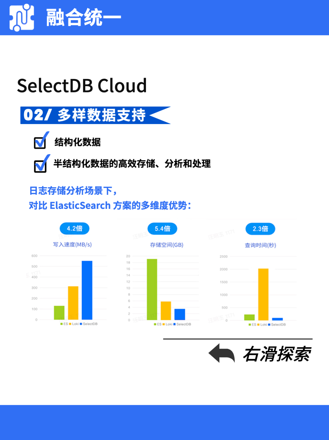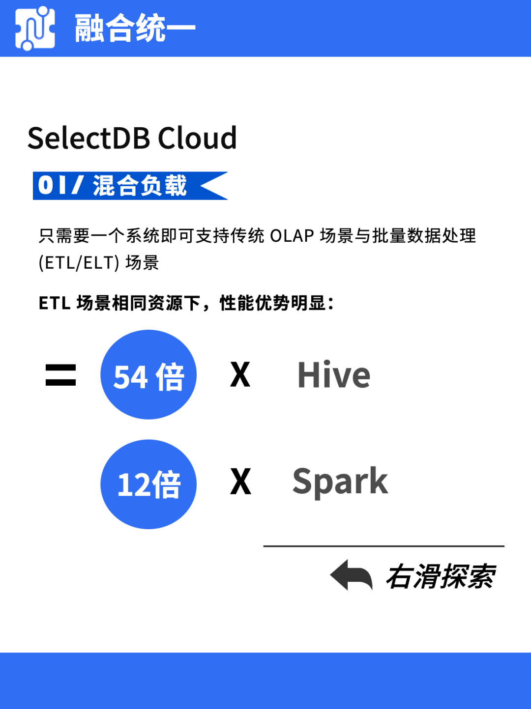 混合负载:SelectDB Cloud 支持传统 OLAP 场景 (实时报表和 Adhoc 分析等),也支持批量数据处理(ETL/ELT)。开发者在将大批量的离线 ETL 变成实时、小批量和增量的 ETL后,SelectDB Cloud 能够利用全内存的框架和向量化的引擎来更加高效的处理数据,可以达到几十倍的性能提升。开发者通过简单、标准的 SQL 语句就可以完成数据加工,SelectDB Cloud 也支持 Java UDF 来完成更加个性化的数据处理逻辑。同时,在云上 SelectDB Cloud 也很便捷的使用单独的 ETL 集群来做隔离。 结构化/半结构化支持:SelectDB Cloud 高效原生支持半结构化数据的高效存储和检索分析,在降低了系统复杂性的同时明显提升了成本和性能的收益。SelectDB Cloud 具有灵活高效存储的能力,支持 Array, JSONB, Map 等复合数据类型和动态 schema 表。同时,SelectDB Cloud 具有丰富索引结构加速检索分析,也能够实现高效分析和处理。 湖仓一体:SelectDB Cloud 还能对已经建设的离线数仓和数据湖进行联邦查询,在实现高性能的同时,不需要迁移历史数据。SelectDB Cloud 支持便捷的元数据打通,免去了手动创建外表的繁琐,同时能够对热元数据自动 cache,并且能够支持手动和自动刷新;同时,SelectDB Cloud 也支持多种外表的联邦查询 (Hive, Iceberg, Hudi 关系型数据库,ES,以及各种支持 HMS 协议的云数仓)。