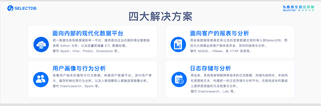使用场景:企业内部报表与分析,更大规模的 ETL 数据工程、行为分析和画像等新型数据应用分析,百万级外部客户高并发需求