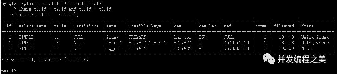 explain select t2.* from t1,t2,t3where t3.id = t2.id and t3.id = t1.idand t3.col_1 = 'col_11';