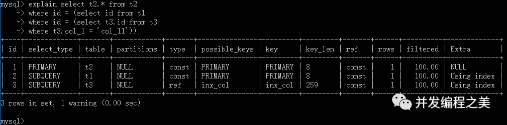 explain select t2.* from t2where id = (select id from t1where id = (select t3.id from t3where t3.col_1 = 'col_11'));