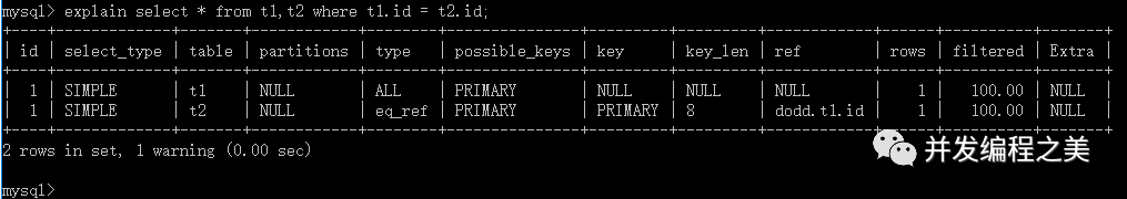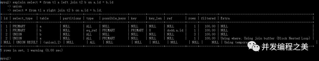 explain select * from t1 a left join t2 b on a.id = b.idunionselect * from t1 a right join t2 b on a.id = b.id;