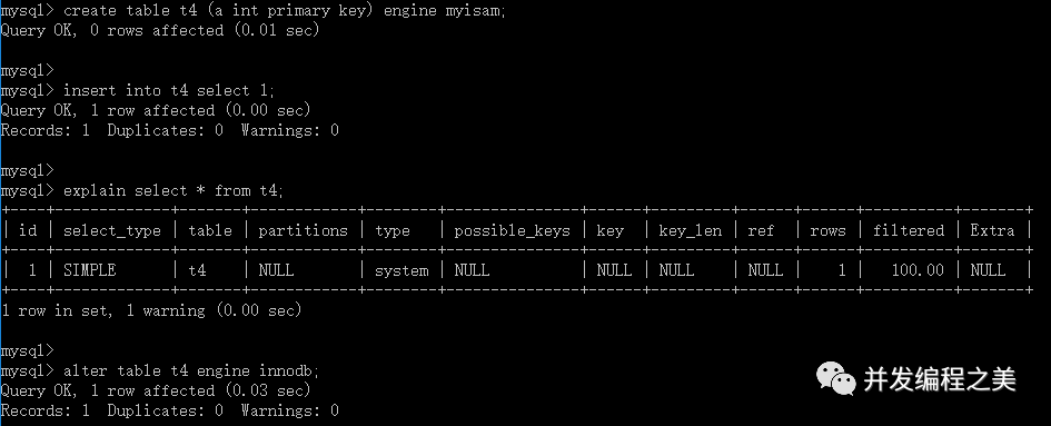 create table t4 (a int primary key) engine myisam;insert into t4 select 1;explain select * from t4;alter table t4 engine innodb;explain select * from t4;