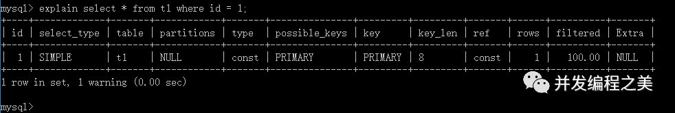 表示表示通过索引一次就找到,const用于比较primary key或者unique索引。因为只匹配一行数据,所以很快如将主键置于where列表中,它会再查询刚开始的时候被读取,之后会被优化器当作常量。