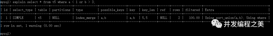 create table t5(a int,b int,key(a),key(b));insert into t5 select 1,2;insert into t5 select * from t5;...explain select * from t5 where a < 1 or b > 3;