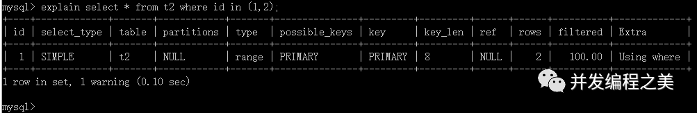 与eq_ref不同的地方在于,当至多只会有一条结果的select出现在where中的in条件时,执行计划的type会显示为unique_subquery。在高版本MySQL(5.6及以上)由于对in子查询有了很多优化,比较难看见这种类型。