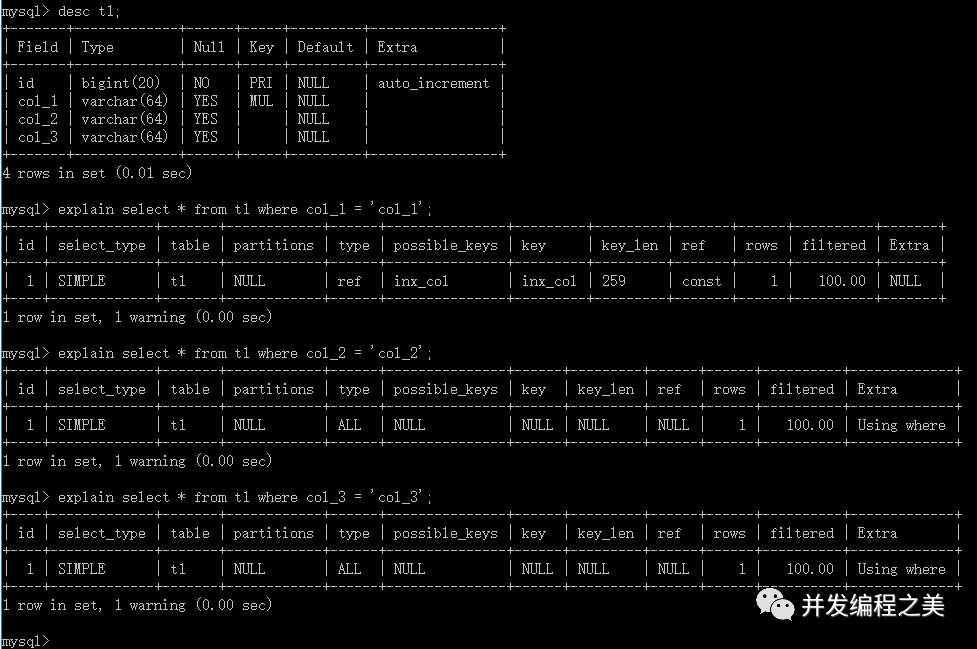 desc t1;explain select * from t1 where col_1 = 'col_1';explain select * from t1 where col_2 = 'col_2';explain select * from t1 where col_3 = 'col_3';