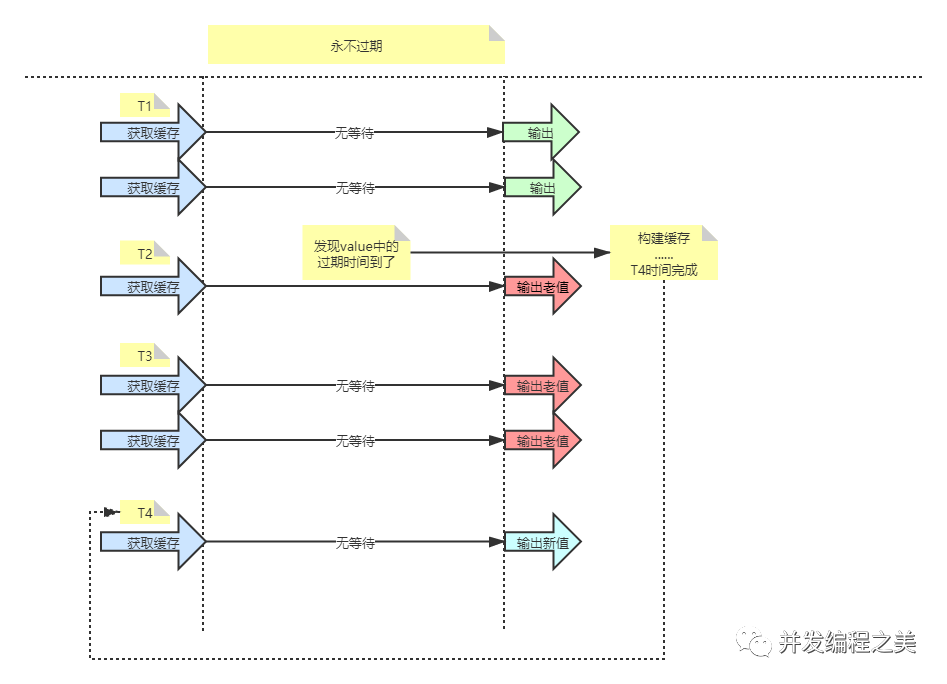 String get(final String key) {V v = redis.get(key);String value = v.getValue();long logicTimeout = v.getLogicTimeout();if (logicTimeout >= System.currentTimeMills()) {String mutexKey = "mutex:key:" + key;if (redis.set(mutexKey, "1", "ex 180", "nx")) {异步更新后台异步执行threadPool.execute(() -> {String dbValue = db.get(key);redis.set(key,dbValue, newLogicTimeout());redis.delete(mutexKey);});}}return value;}