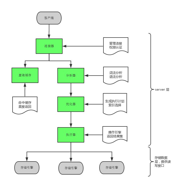 根据自己的理解,我画了个不那么专业的执行流程图,先给出这条 SQL 语句的执行流程,再逐步解析每个流程,执行流程图如下: