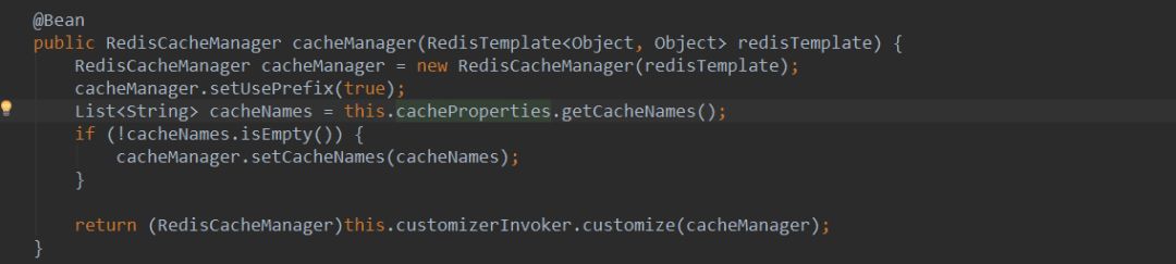 看日志大概就发现一个非法状态异常,我们继续查看接下来的日志有一段非常的重要日志 Overriding bean of same name 翻译过来的意思是帮你重写了一个名字一样的 Bean,我再看看日志里有提到 RedisCacheManager 与我自己实现的 cacheManager 到这里我已经感觉到问题所在了,以下图为 RedisCacheManager 部分实现代码。和我自己的 Shiro 的 cacheManager 实现方法。