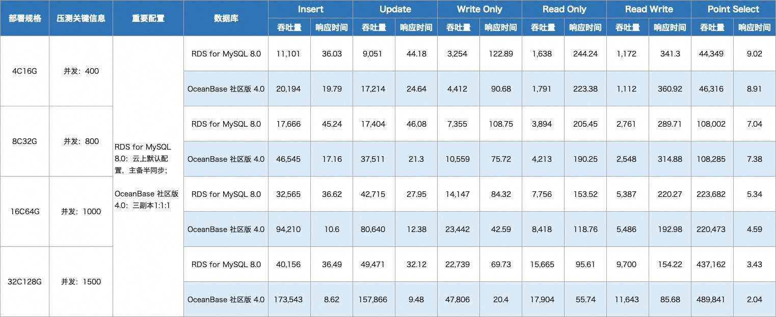 表1 OceanBase 社区版 4.0 & RDS for MySQL 8.0 Sysbench 性能测试结果(吞吐量和响应时间)