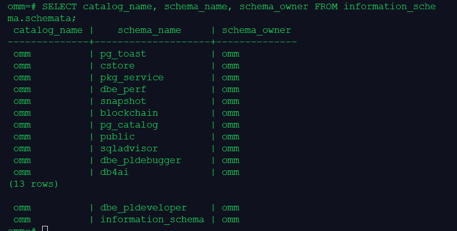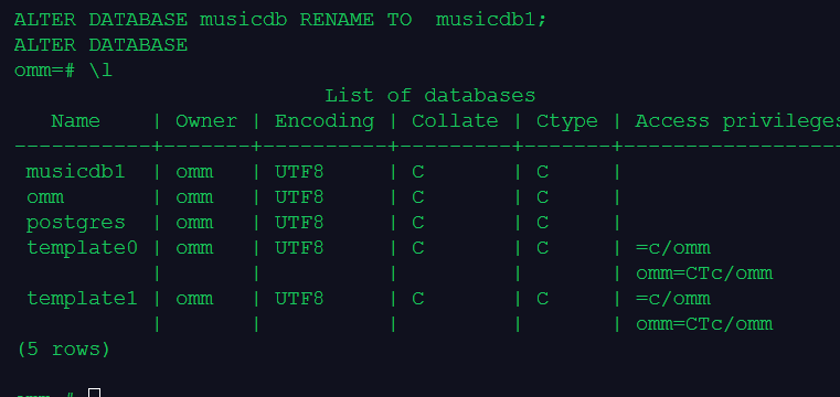 第十一课的内容是关于数据库管理方面的内容,其中包括在数据库中创建模式、表等对象,以及对数据库的创建、删除、重命名、查看信息等,这在现实使用中也是非常必须的。以下是我本课的作业完成情况: