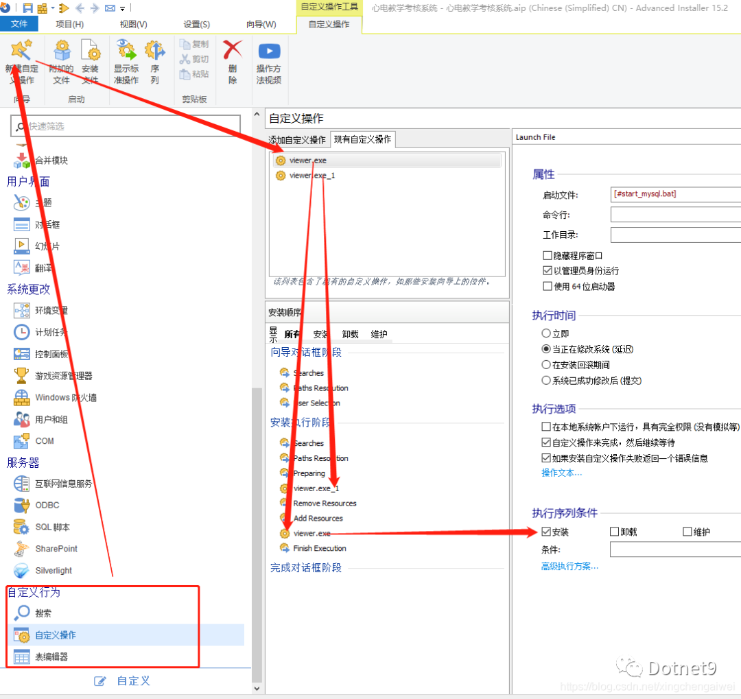 安装原理很简单在Advanced Installer项目的“自己定义行为中。“新建自定义操作”,在安装过程中执行MySql安装包中的脚本文件start_mysql.bat即可,卸载时执行stop_mysql.bat文件即可。将需要执行的sql语句存放到bin目录下的exam.sql文件中,这个文件中我提供了root用户的权限和密码,创建了一个数据库。后续需要可以自己进行补充。