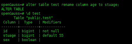 ALTER TABLE test RENAME COLUMN age TO stuage;