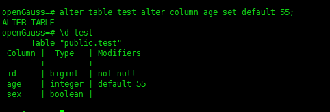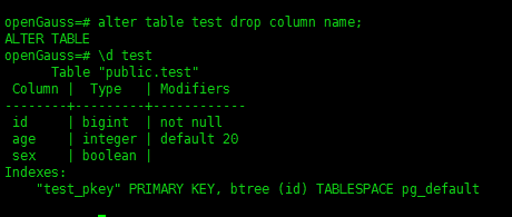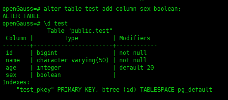 3、为test表新增一个列,列名为sex,数据类型为boolean