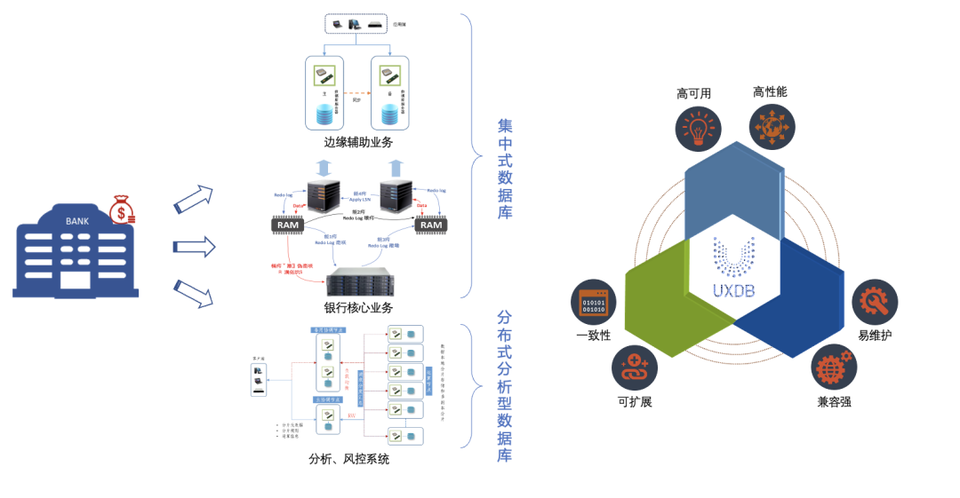业务系统与数据分析应用场景差异大。银行核心业务系统存在业务实时数据分析需求,同时业务数据也在持续增长,基于此背景,客户往往希望一套核心数据库可实现多种业务场景,实现OLTP和OLAP。为了避免分析行为影响业务功能,大型的核心业务系统构建时,会考虑分库处理,但是两套库之间数据同步延迟高,对业务开展有一定影响。且系统结构过于复杂,管理维护难度大、成本高。