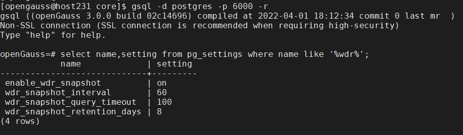 生成WDR报告的前提条件是,打开参数enable_wdr_snapshot。确认当前已按照的openGauss数据库是否打开WDR报告的参数,需要通过下图登录数据库进行查询。enable_wdr_snapshot的值为on表示打开,off表示关闭。