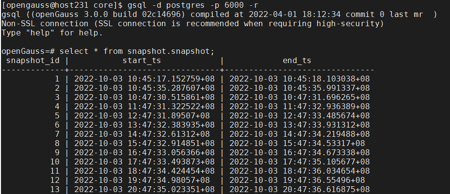当在openGauss数据库执行性能测试,数据库默认每小时自动执行一次snapshot操作。生成指定时间段内的wdr报告,查询快照视图后选取指定开始时间的快照id,结束时间的快照id。通过函数generate_wdr_report生成wdr报告。但是有些情况,固定时间段的wdr报告,就需要使用具有sysadmin权限用户手工创建快照信息,需要执行两次。具体操作步骤如下:
