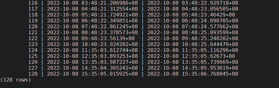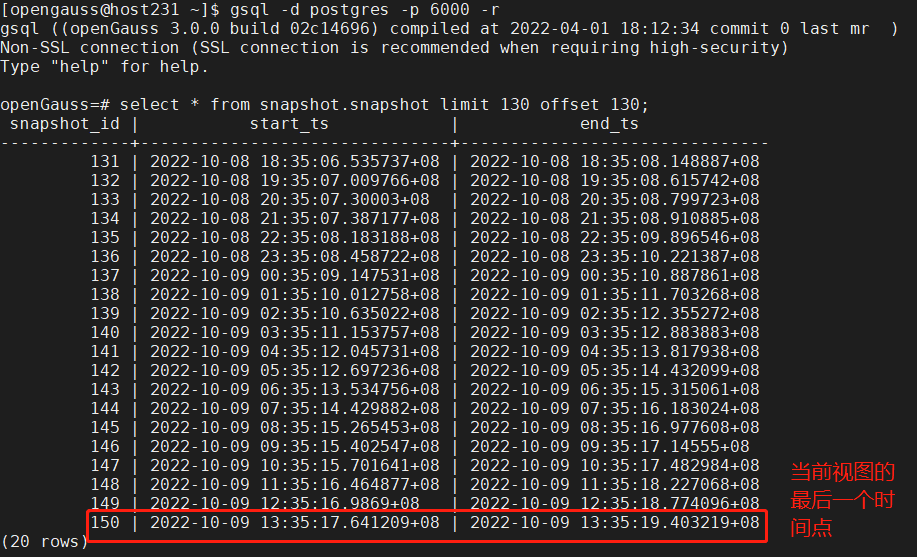 3)向性能报告wdrTest.html中写入数据,从snapshot.snapshot视图中选取要生成WDR报告的时间点。例如:127和128两个时间点。