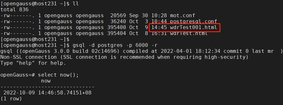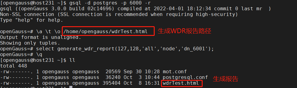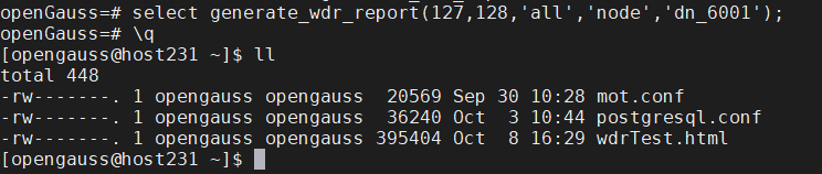 4)目录下生成对应的wdr报告,cd home/opengauss生成报告的指定路径进行查看。