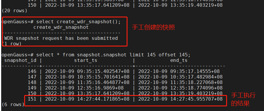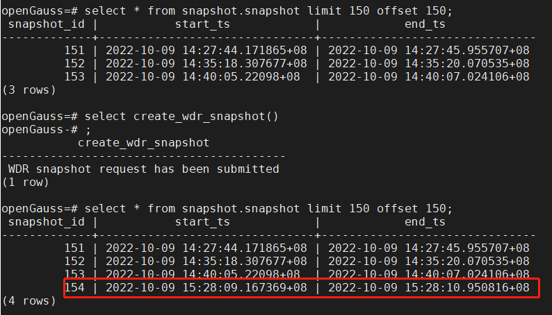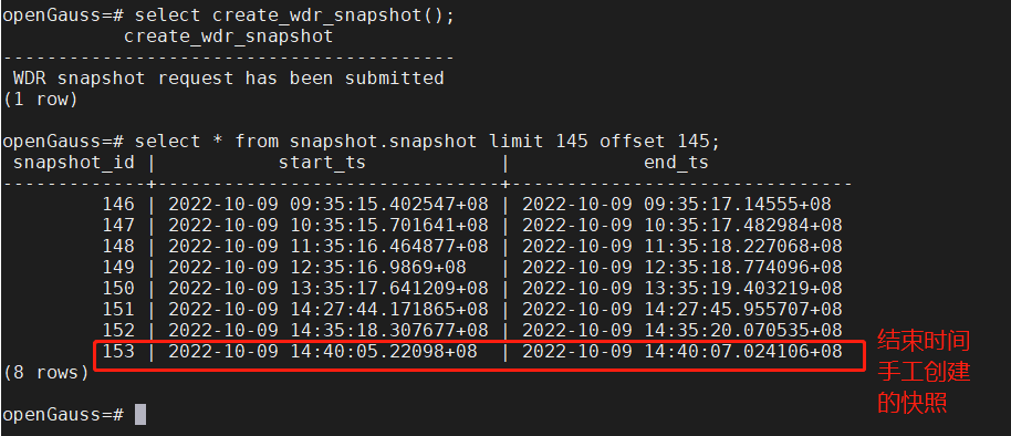 3)等待10分钟以后再次执行函数create_wdr_snapshot(),手工创建结束快照。
