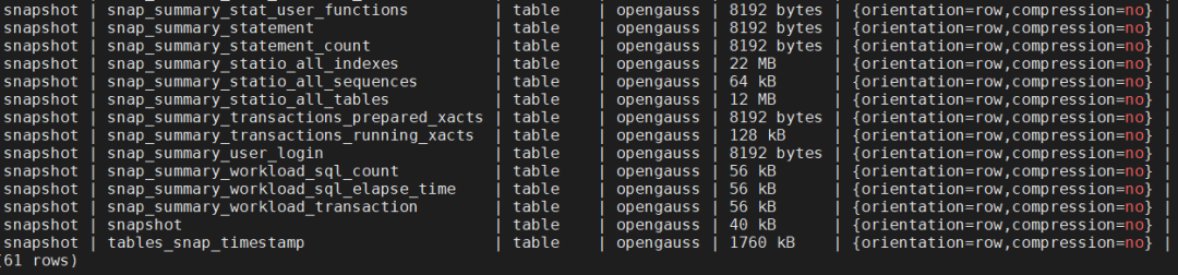 WDR的数据表保存在snapshot这个schema下以snap_开头的表,其数据来源于dbe_perf这个schema内的视图,总共61张视图。