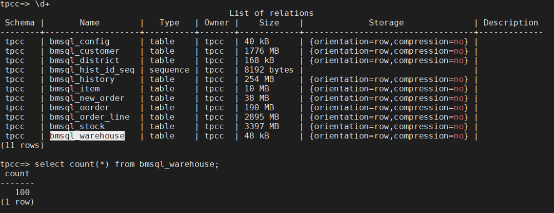 1)下图是执行前tpcc表信息: