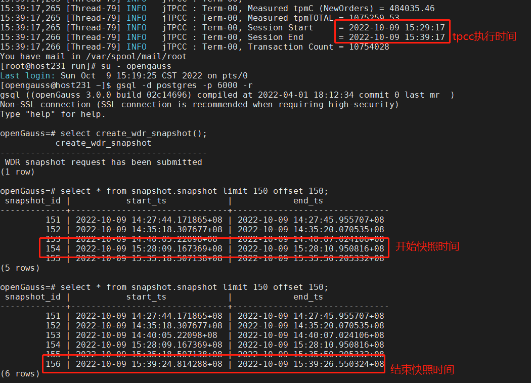 3)开始执行benchmarksql,运行10分钟完成后。手工再次生成wdr报告的结束快照。