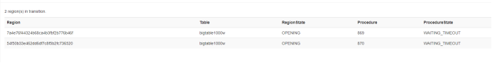 hbase(main):004:0* list_locksTABLE(bigtable1000w)Lock type: SHARED, count: 2REGION(7a4e76f44324b68ca4b3fbf2b776b46f)Lock type: EXCLUSIVE, procedure: {"className"=>"org.apache.hadoop.hbase.master.assignment.UnassignProcedure", "parentId"=>"868", "procId"=>"869", "submittedTime"=>"1647402770402", "owner"=>"hbase", "state"=>"WAITING_TIMEOUT", "stackId"=>[5, 7, 8, 10, 12, 15, 17, 19, 21, 22, 24, 26, 28, 30, 32, 34, 36, 38, 40, 42, 44, 46, 48, 51, 53, 55, 57, 58, 60, 62, 64, 66, 68, 70, 72, 74, 76, 78, 80, 82, 84, 86, 88, 90, 92, 94, 96, 98, 100, 102, 104, 106, 108, 110, 112, 114, 116, 118, 120, 122, 124, 126, 128, 130, 132, 134, 136, 138, 140, 142, 144, 146, 148, 150, 152, 154, 156, 158, 160, 162, 164, 166, 168, 170, 172, 174, 176, 178, 180, 182, 184, 186, 188, 190, 192, 194, 196, 198, 200, 202, 204, 206, 208, 210, 212, 214, 216, 218, 220, 222, 224, 226, 228, 230, 232, 234, 236, 238, 240, 242, 244, 246, 248, 250, 252, 254, 256, 258, 260, 262, 264, 266, 268, 270, 272, 274, 276, 278, 280, 282, 284, 286, 288, 290, 292, 294, 296], "lastUpdate"=>"1647485472955", "timeout"=>600000, "stateMessage"=>[{"transitionState"=>"REGION_TRANSITION_DISPATCH", "regionInfo"=>{"regionId"=>"1647248063686", "tableName"=>{"namespace"=>"ZGVmYXVsdA==", "qualifier"=>"YmlndGFibGUxMDAwdw=="}, "startKey"=>"", "endKey"=>"NTAxNjQ2MTIzMDMw", "offline"=>false, "split"=>false, "replicaId"=>0}, "hostingServer"=>{"hostName"=>"cdh01", "port"=>16020, "startCode"=>"1647397806214"}, "attempt"=>147}], "locked"=>true}