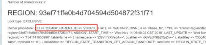 可以看到EXCLUSIVE的lock只有region级别的,图中红框圈出来的就是占有这个锁的procedure id以及它的parent procedure id, 由此我们知道如果想要重新assign/unassign这个region,那么一定要bypass这个procedure。