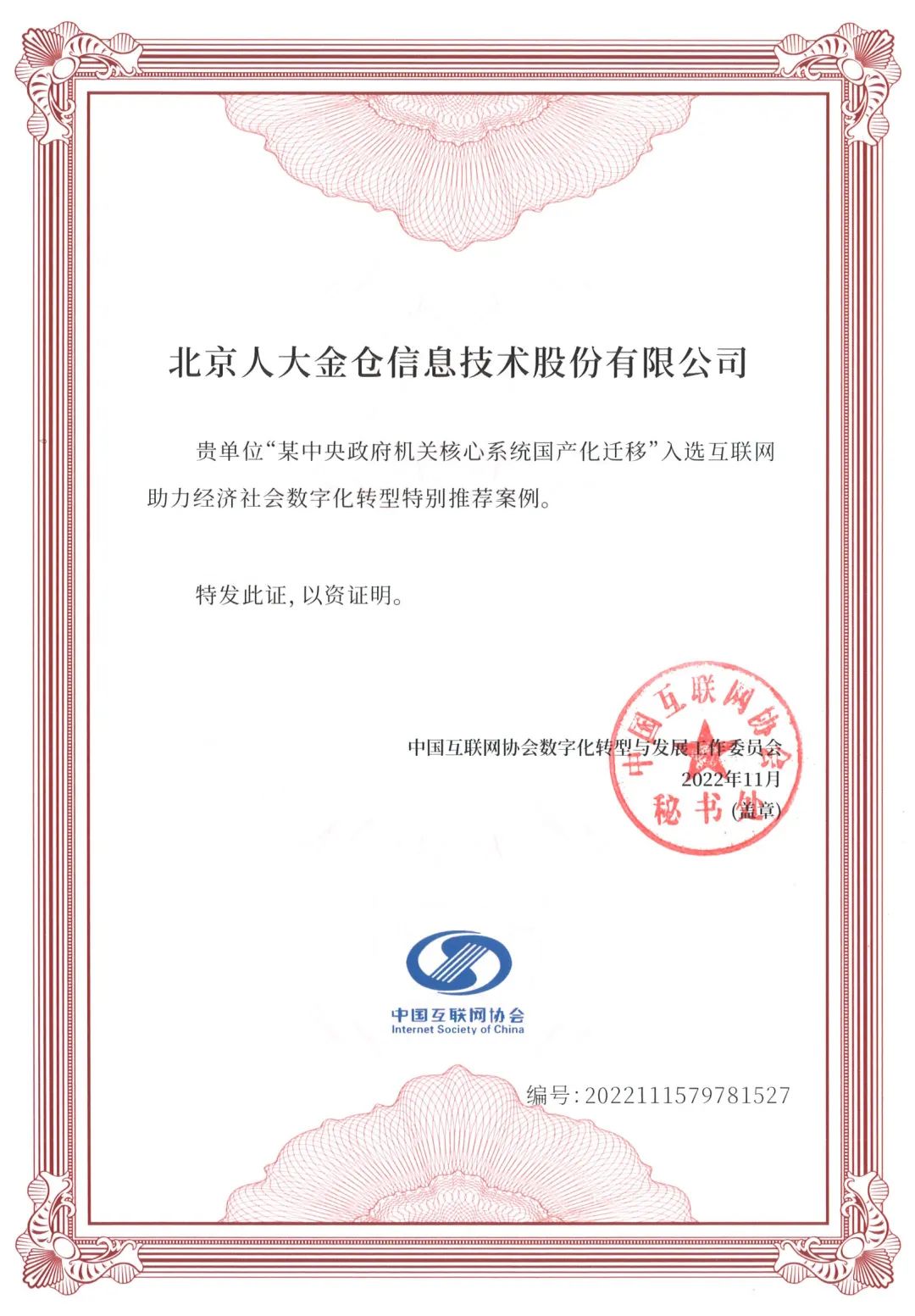 近日,由工业和信息化部、深圳市人民政府主办的2022(第二十一届)中国互联网大会在深圳顺利举行。大会开幕式论坛发布了“互联网助力经济社会数字化转型”案例名单,人大金仓“某中央政府机关核心系统国产化迁移项目”入选特别推荐案例。