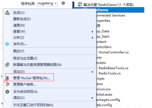 通过网络下载或nuget安装,得到Redis相关的dll,添加到项目中引用。这里介绍下通过NuGet方式添加