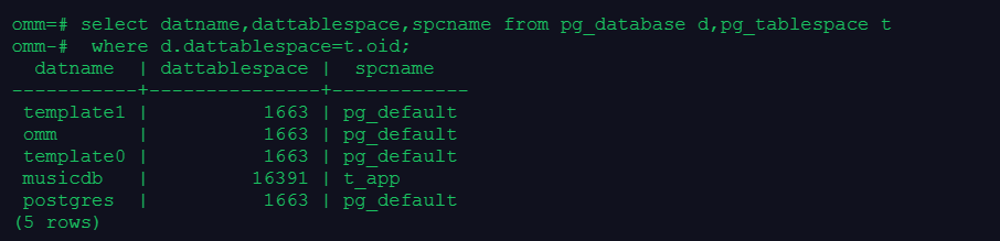 select datname,dattablespace,spcname from pg_database d,pg_tablespace t