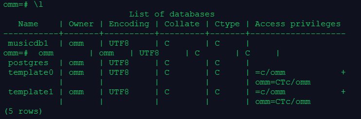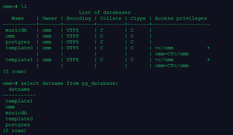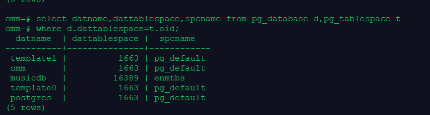 create database musicdb with tablespace=enmtbs;2、查看数据库集簇中有哪些数据库。