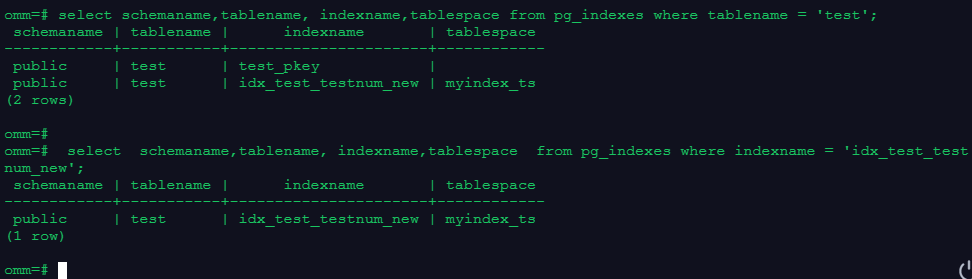 select schemaname,tablename, indexname,tablespace from pg_indexes where indexname = 'idx_test_testnum_new';