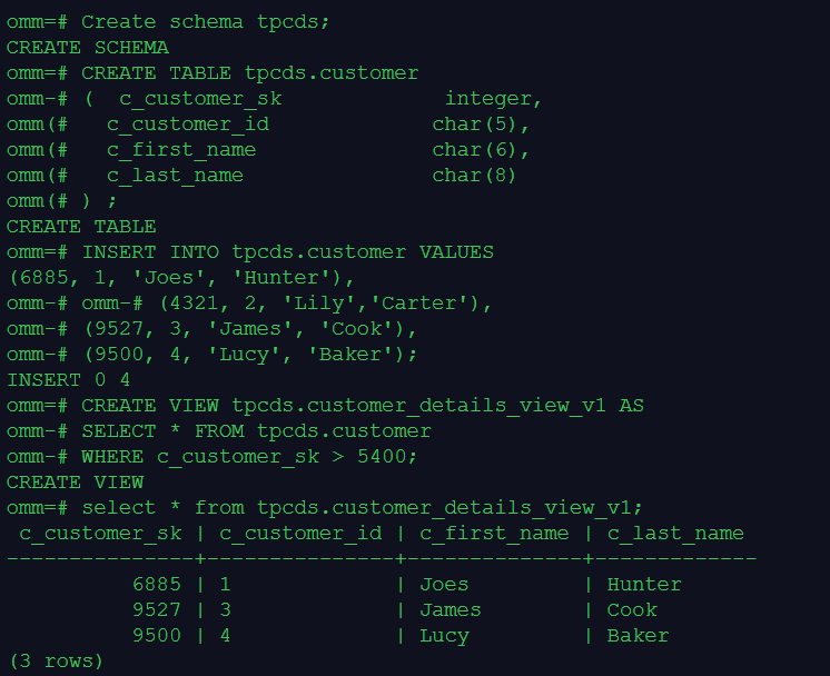 掌握openGauss视图的管理:创建视图、删除视图、查询视图的信息、修改视图的信息。
