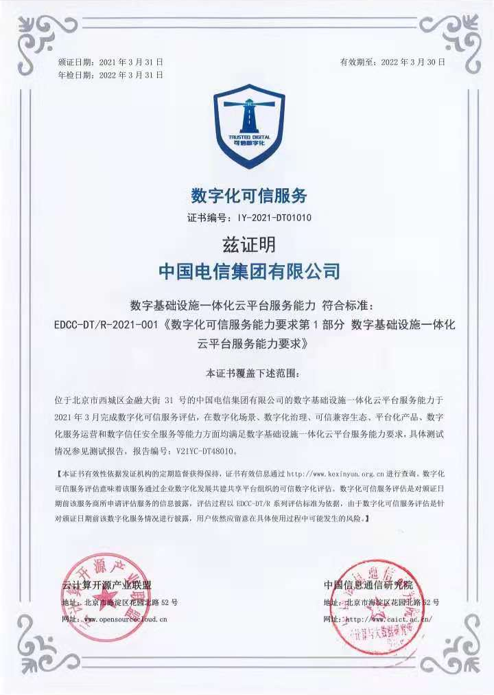 2021年3月31日,中国信息通信研究院和中国信息标准化协会在北京联合主办了2021数字化转型发展高峰论坛。会上,中国电信通过首批基础设施一体化云平台服务能力的数字化可信服务认证。数字化可信服务认证是中国信通院从数字化场景、数字化治理、可信兼容生态、平台产品化、数字化服务运营、数字信任安全服务6大能力对第三方的数字化服务和解决方案的评估,拥有近400项能力指标项,该认证可以帮助企业准确绘制数字化“能力地图”,快速找到短板和漏洞,并制定“精准发力”的解决方案,加快转型升级步伐。中国电信六云平台经过信通院一个多月的调研和评估,成功通过首批基础设施一体化云平台服务能力的数字化可信服务认证。六云平台包括云翼(统一PaaS平台)、云道(DevOps应用开发平台)、云眼(AIOPS智能运维平台)、云桥(DCOOS能力开放平台)、云迁(数据迁移平台)、云聚(混合多云管理平台)。