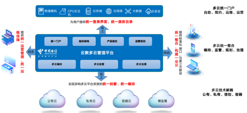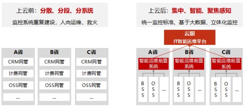 2020年7月,中国电信整合打造多云管理平台,正式对外推出云聚。云聚提供跨数据中心、多资源池、异构多云的集约化管理,实现对多云服务的统一申请、统一编排、统一管控、统一运维、统一运营,帮助客户实现端到端资源集成整合能力,通过统一的编排调度,可有效管控和追踪IT资源,变被动运维为主动运营。通过成本、预算、操作、安全性以及涉及多云的风险和合规性的整合,实现整个云环境的治理。2020年10月,云眼平台(即AIOPS智能运维平台)正式在中国电信全面IT上云中运用。它可以做到跨系统监控和跨I/P/SaaS层监控,供全网开展端到端跨业务监控,实现故障快速发现、定位等,从而大幅提升线上问题诊断的效率。其中某省围绕“云眼平台”+本地自研的“大白系统”,实现了IT系统的立体化、无死角的监控,构建标准化和流程化的运维体系。