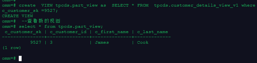 omm=# create VIEW tpcds.part_view as SELECT * FROM tpcds.customer_details_view_v1 where c_customer_sk =9527;