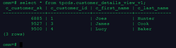 omm=# CREATE VIEW tpcds.customer_details_view_v1 AS
