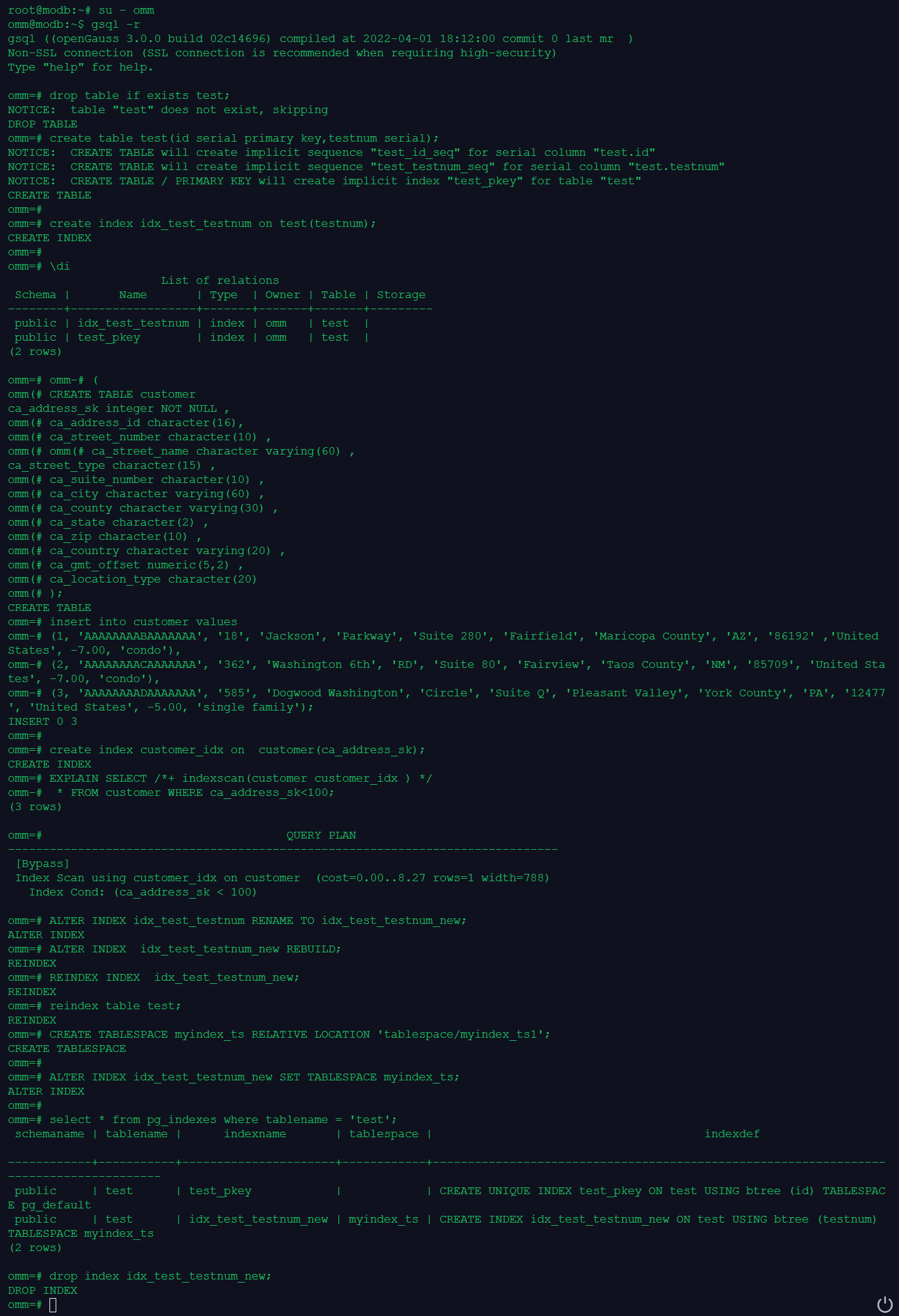 掌握openGauss DBMS索引的管理:创建索引、删除索引、查询索引的信息、修改索引的信息。