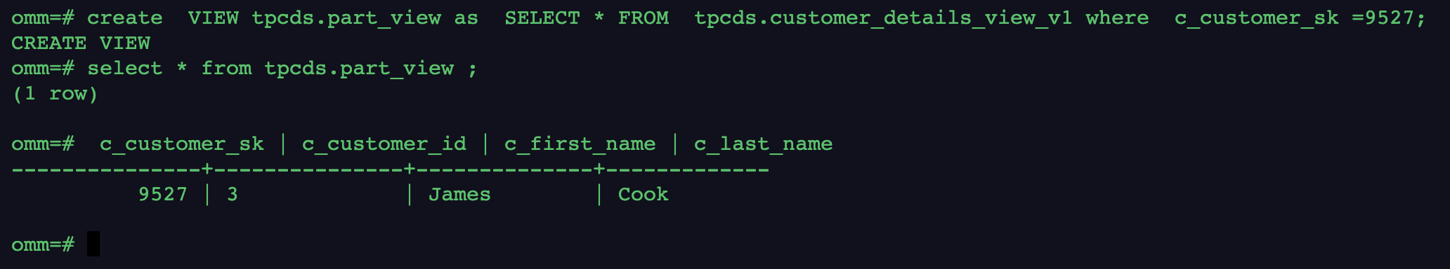omm=# create VIEW tpcds.part_view as SELECT * FROM tpcds.customer_details_view_v1 where c_customer_sk =9527;
