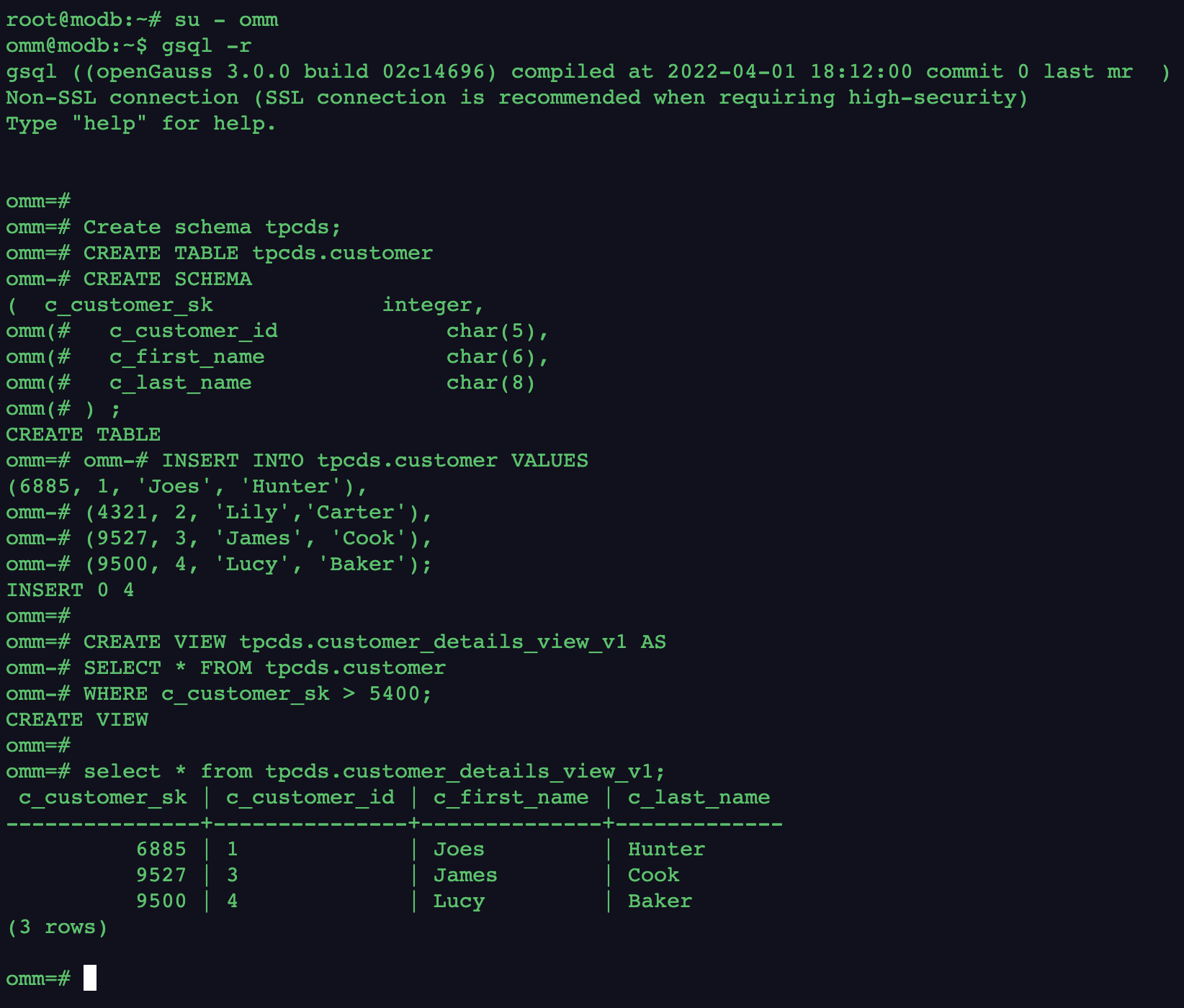omm=# CREATE VIEW tpcds.customer_details_view_v1 AS