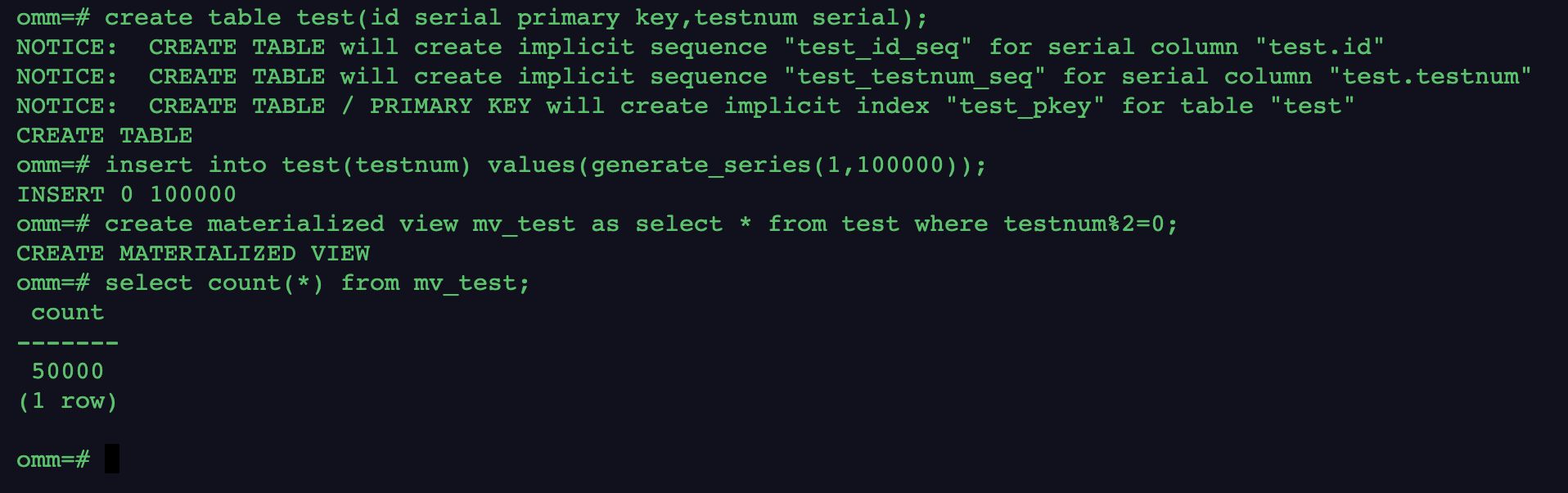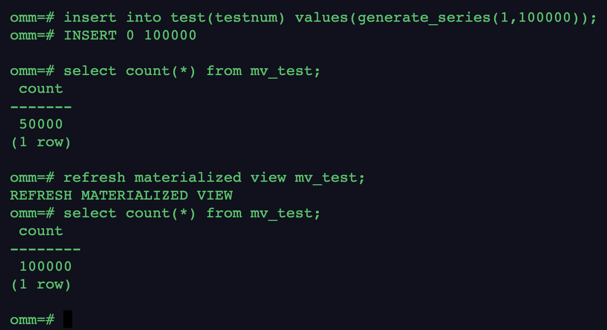 omm=# select count(*) from mv_test;