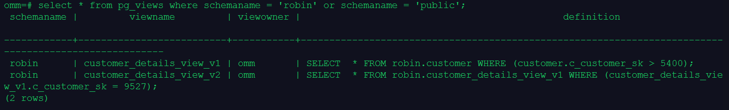 select * from pg_views where schemaname = 'robin' or schemaname = 'public';