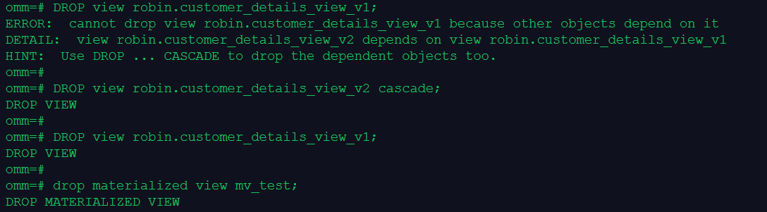 ERROR: cannot drop view robin.customer_details_view_v1 because other objects depend on it